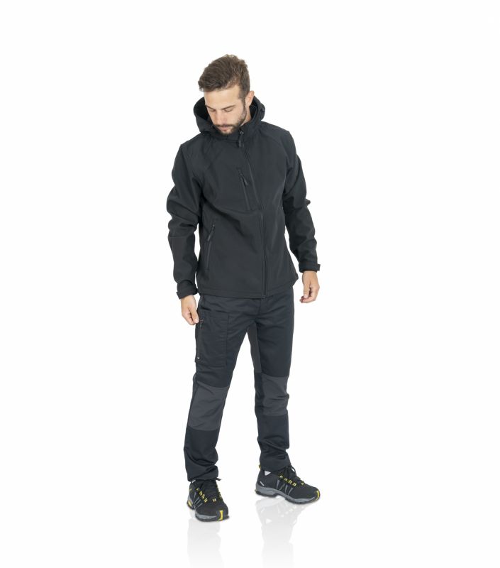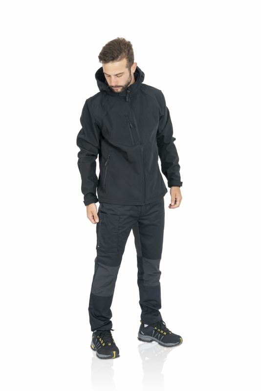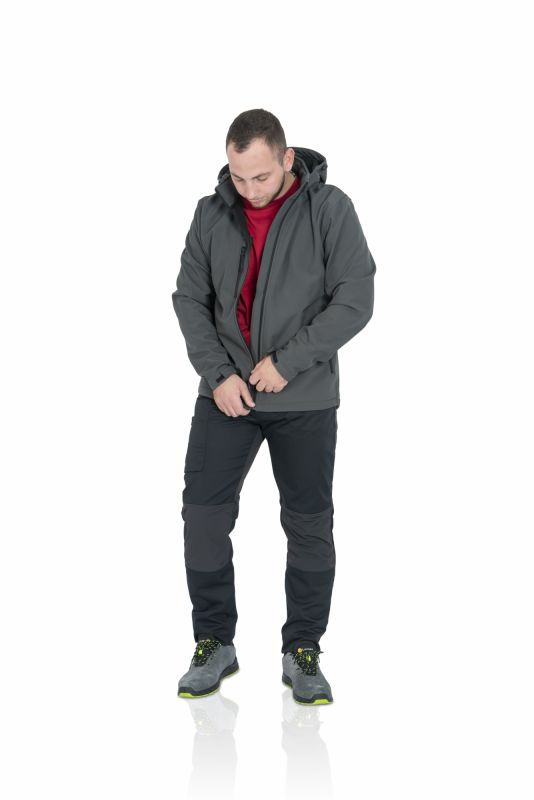 Jakna softshell sa skidanjem kapuljače, visoka kragna, elastični učkuri sa steznim regulatorima u kapuljači, čičak traka za podešavanje širine na dnu rukava, dva prednja džepa sa rajsferšlusom i jedan džep na grudima.