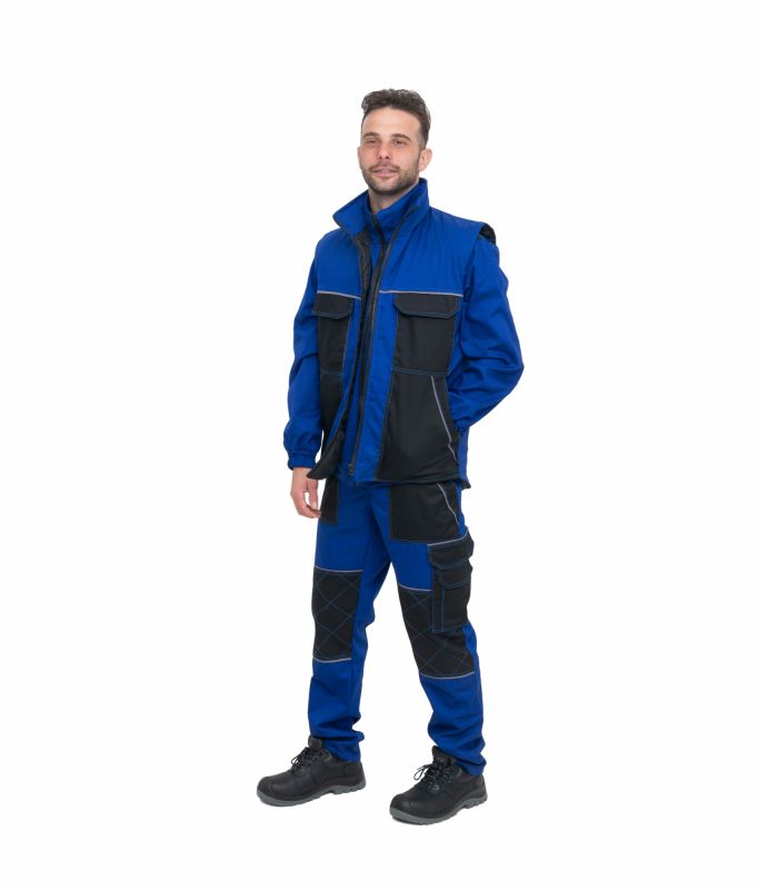 Komplet radno odelo sa prslukom sadrži radni prsluk, radnu bluzu i treger pantalone/radne pantalone (moguće izabrati donji deo).